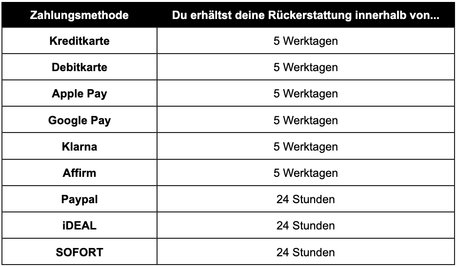 In der folgenden Tabelle finden Sie weitere Informationen darüber, wann Sie mit Ihrer Rückerstattung, je nach Zahlungsmethode, rechnen können.