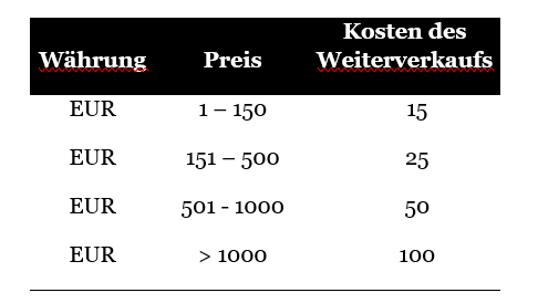 Für alle Transaktionen werden dem Käufer Kosten in Höhe von fünfzehn Prozent (15%) des Produktkaufpreises berechnet, in allen Fällen eine Mindestgebühr von fünf (5) Euro/Pfund/Dollar/Schweizer Franken (oder den Gegenwert in Landeswährung).