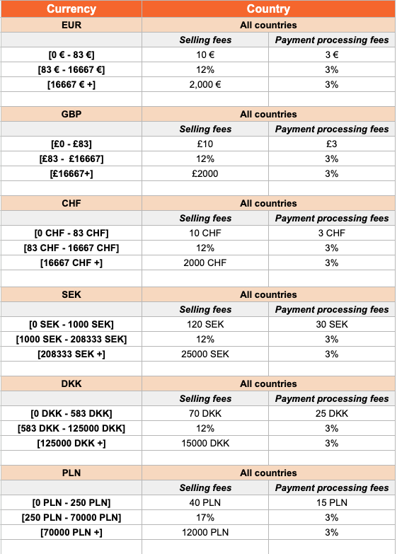 All items priced in GBP between £83 and £16,667 have a selling fee of 12%. Items priced under £83 have a fixed selling fee of £10. Items costing more than £16,667 have a fixed selling fee of £2,000.