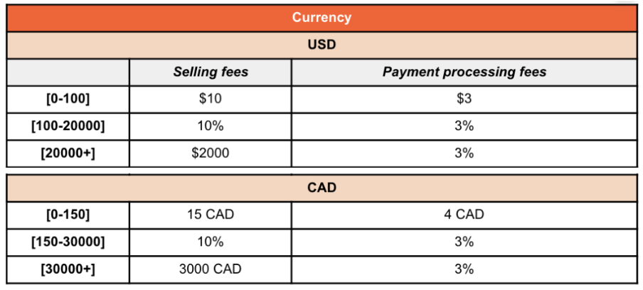A payment processing fee of 3% (min 4 CAD) will also be charged on your sale to cover the external processing costs of your transaction.