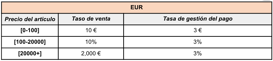 *Todos los artículos con un precio en EUROS entre 100€ y 20000€ tienen una tasa de venta del 10%. Los artículos con un precio inferior a 100€ tienen una tasa de venta fija de 10€. Los artículos con un precio superior a 20000 tendrán una tasa de venta fija de 2000€.