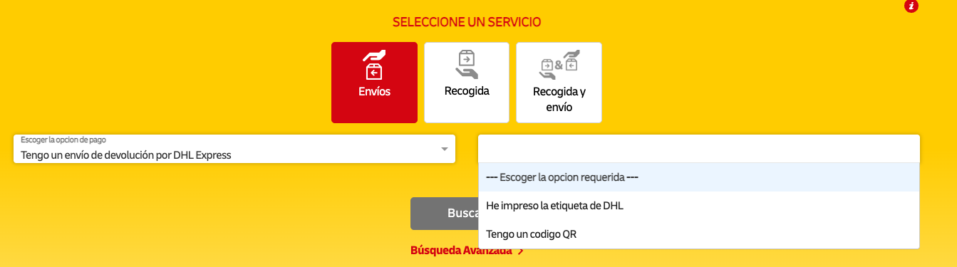 -Opción de gestión: "Tengo un código QR" o "Tengo una etiqueta de DHL impresa