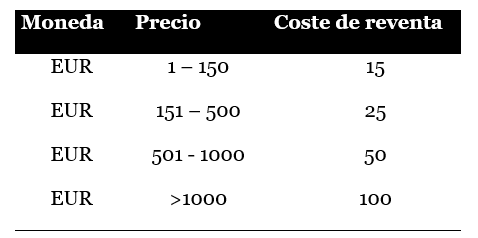 Para todas las transacciones, se cobrará al Comprador una comisión de hasta el quince por ciento (15 %) del Precio del Producto, sujeto, en todos los casos, a una tasa mínima de cinco (5) euros/libras/dólares/francos suizos (o su equivalente en moneda local).