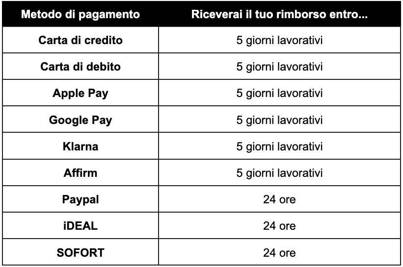Per maggiori informazioni sui tempi di attesa per il rimborso, si prega di consultare la seguente tabella che tiene conto del metodo di pagamento utilizzato.
