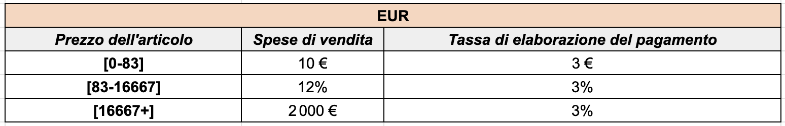 *Tutti gli articoli con un prezzo in EURO compreso tra 83€ e 16667€ hanno una spesa di vendita del 12%. Gli articoli di prezzo inferiore a 83€ hanno una spesa di vendita fissa di 10€. Gli articoli con prezzo superiore a 16667€ hanno una spesa di vendita fissa di 2000€.