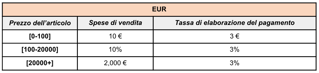 *Tutti gli articoli con un prezzo in EURO compreso tra 100€ e 20000€ hanno una spesa di vendita del 10%. Gli articoli di prezzo inferiore a 100€ hanno una spesa di vendita fissa di 10€. Gli articoli con prezzo superiore a 20000€ hanno una spesa di vendita fissa di 2000€.