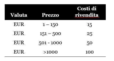 Per tutte le transazioni, verrà addebitata all’Acquirente una commissione fino al quindici per cento (15%) del Prezzo del Prodotto,soggetto, in tutti i casi, a una commissione minima di cinque (5) euro/libbre/dollari/franchi svizzeri (o equivalente in valuta locale).