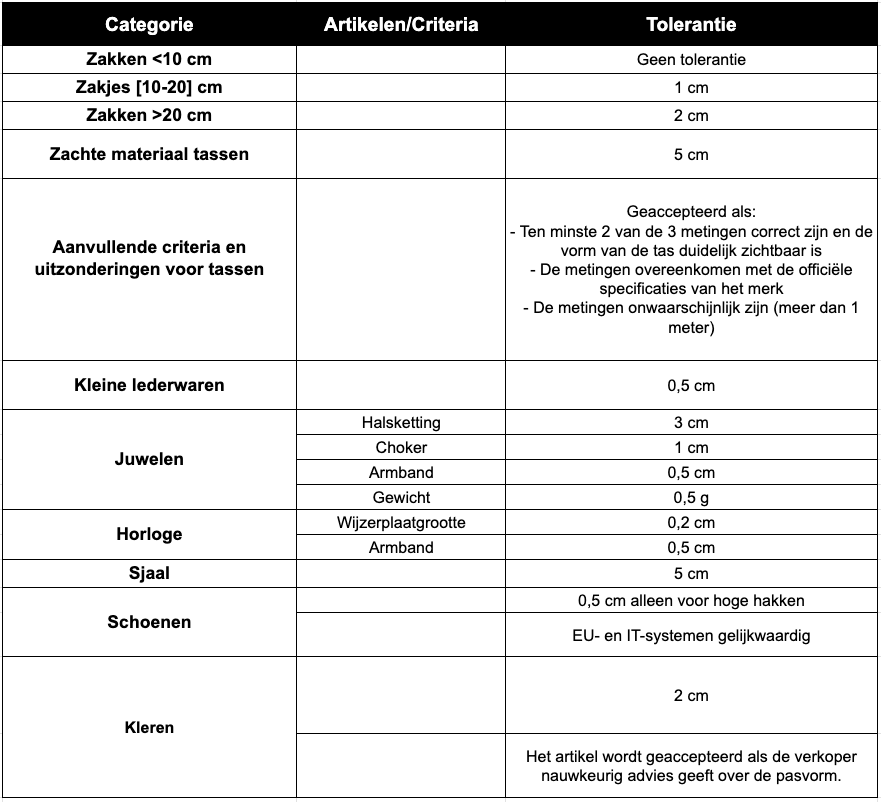 Als uw item hieronder niet wordt vermeld, moet u er rekening mee houden dat er geen foutmarge wordt geaccepteerd.