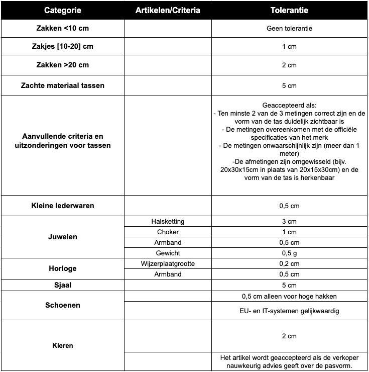 We accepteren een foutmarge met betrekking tot metingen of gewicht. Dit betekent dat binnen de foutmarge hieronder, mits het artikel overeenkomt met de beschrijving die door de verkoper is verstrekt (merk, model, enz.), het artikel zal worden geaccepteerd door onze kwaliteitscontrole-teams. Op basis van deze acceptatie van het artikel kan elk toekomstig retourverzoek van een koper worden geweigerd.