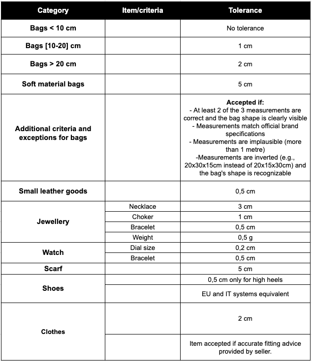 例如:如果賣方為袋子提供20厘米的尺寸,而我們的質量控制團隊確認了22厘米的量度,則該物品將被批准。